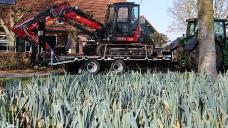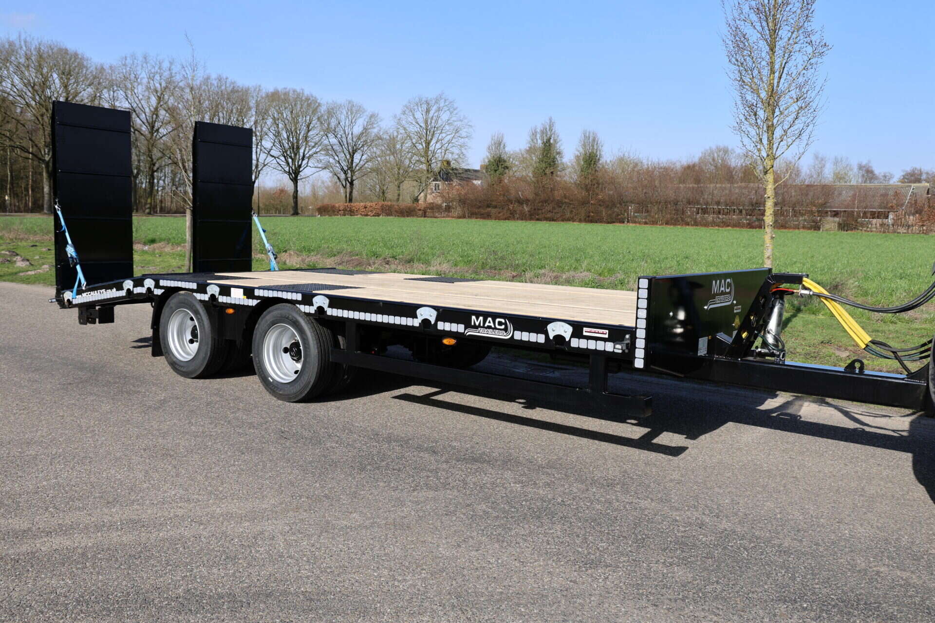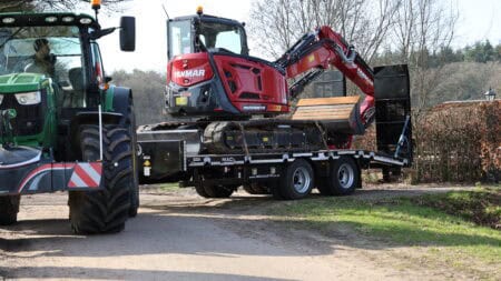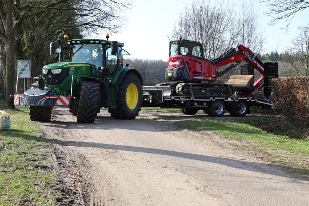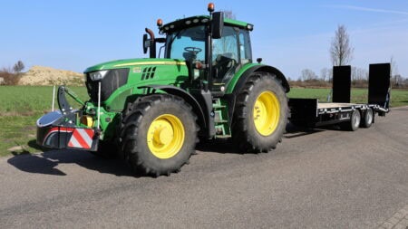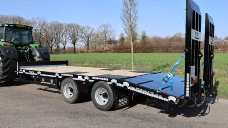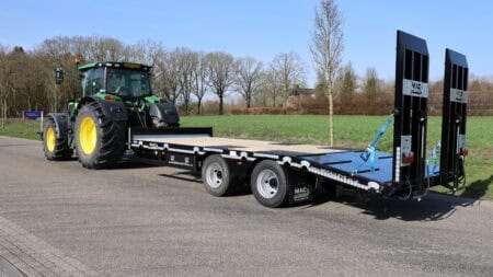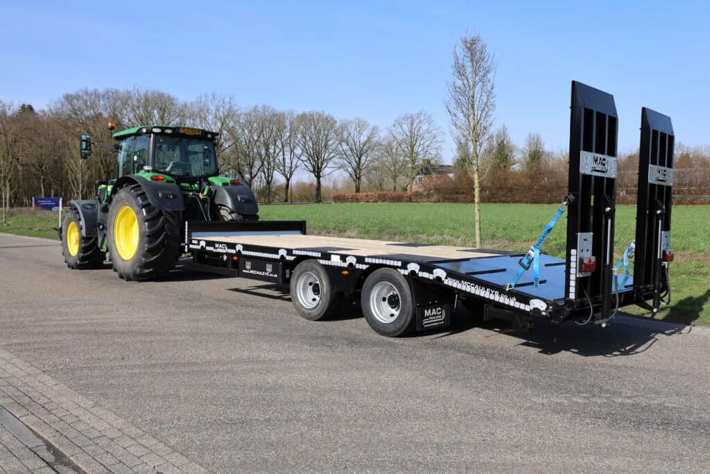 De trailer is robuust gebouwd en gemaakt van materialen van hoge kwaliteit. Dat helpt om het geheel stabiel te houden tijdens transport. Onder de wagen zitten dubbelluchtbanden in de maat 235/75-17.5 en twee 10 ton’s landbouwassen. In combinatie met de lucht beremming met ALR zorgt dit voor een gecontroleerde en stabiele rit tijdens het vervoeren van machines.